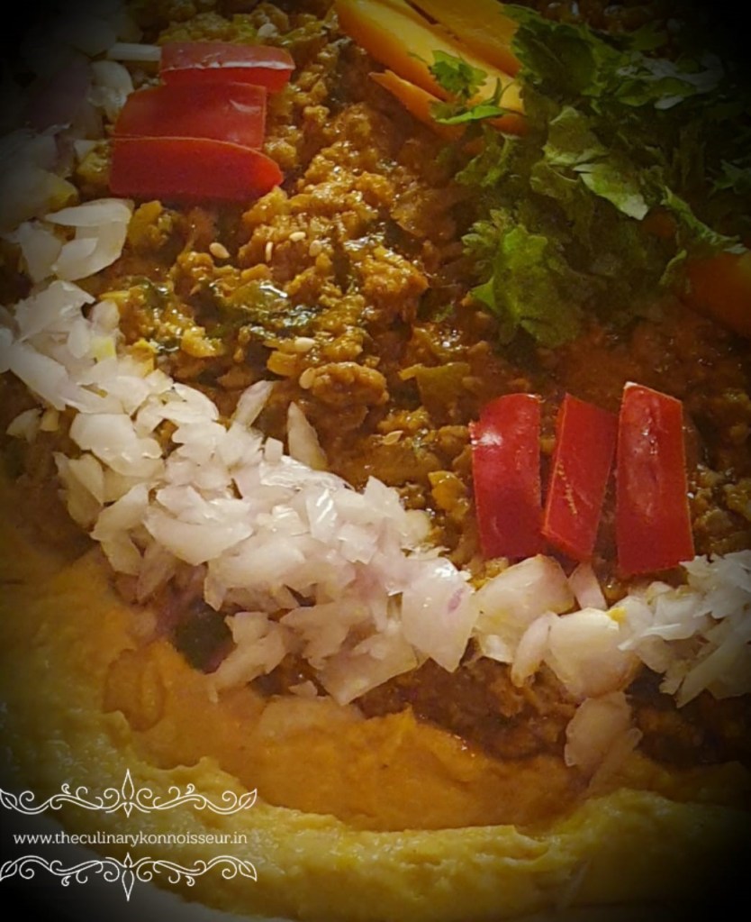 Featured here a sweet-spicy-smokey sweet roasted red pepper hummus, layered with stir fried mildly spiced lamb mince topped with a little tomato salsa to tingle your taste buds & oozing with the goodness of olive oil!