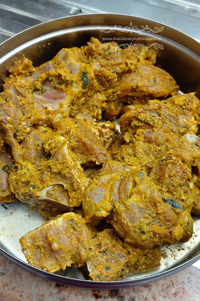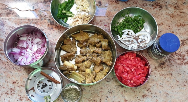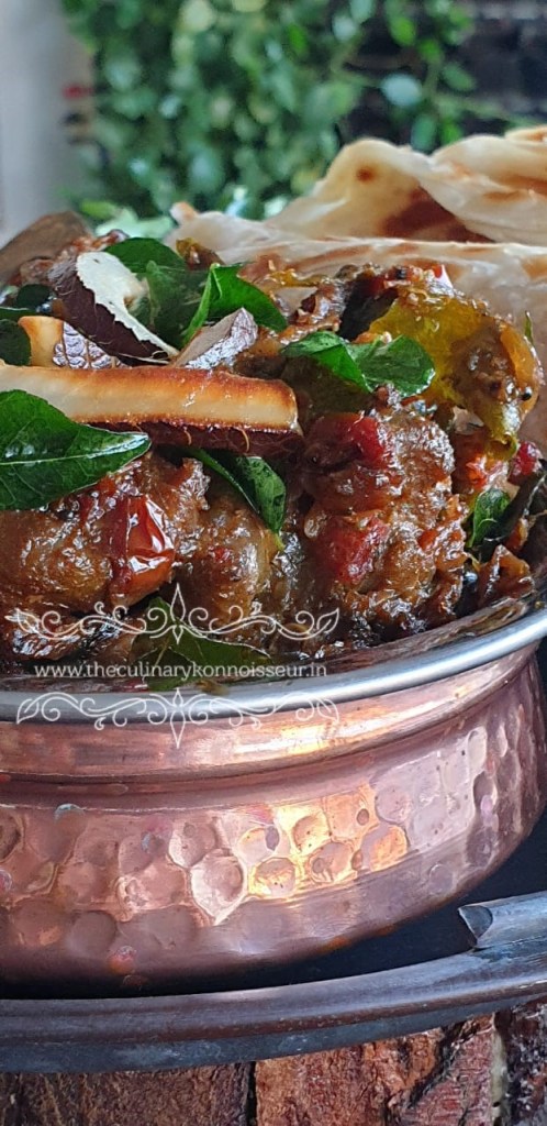 Like most marinated meat dishes, this one too tastes much better the following day, by which time, the medley of flavours of the robust spices such as cinnamon, cardamom, fennel, cloves have managed to work their magical charm with loads of fragrant aromatics such as curry leaves, ginger, garlic and fine coconut slivers, all of them infusing into the tempering in coconut oil, beautifully coating the meat! No wonder then, that this dish is one of those that are especially the pride of Syrian Christian cooking.