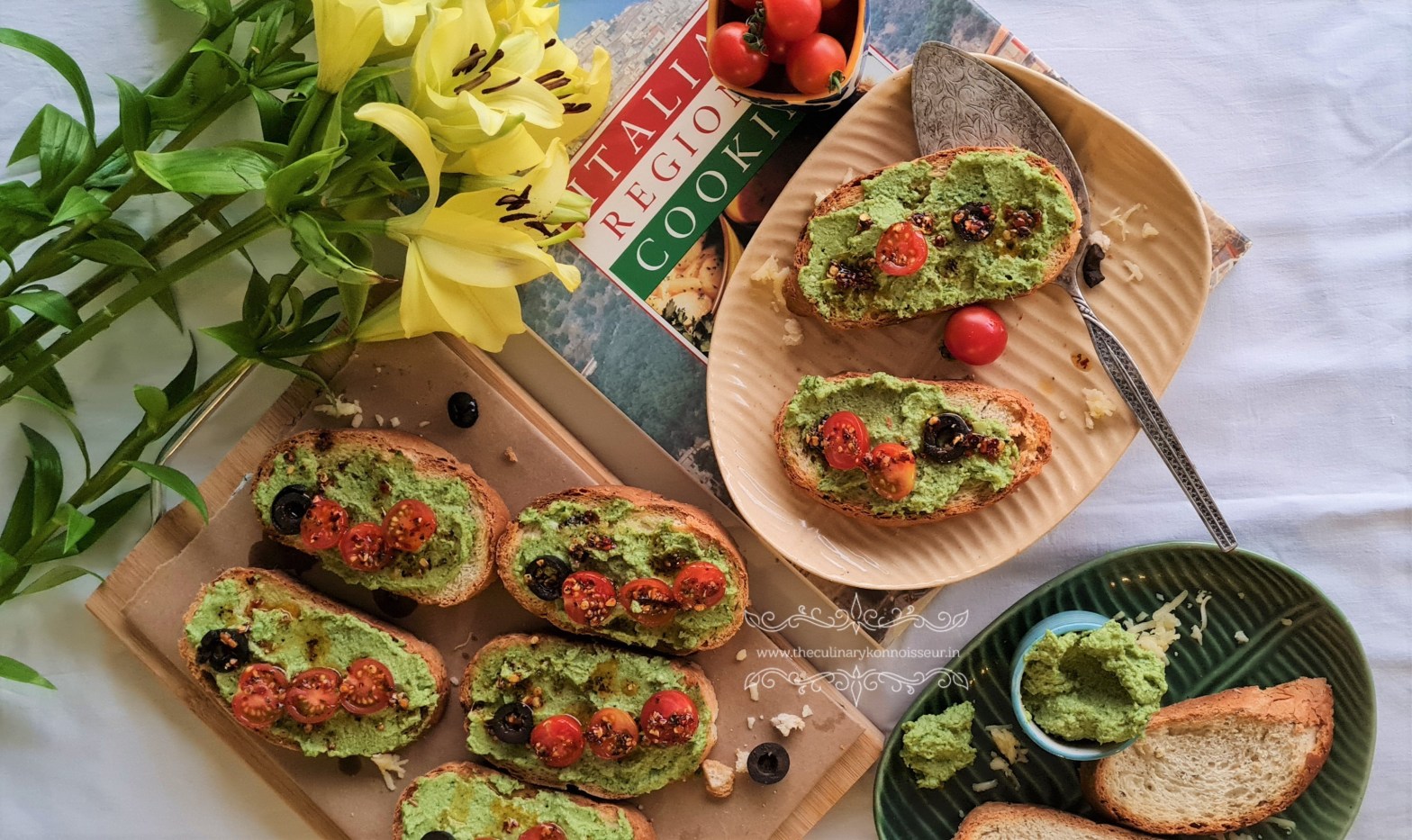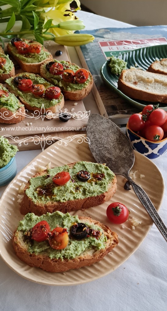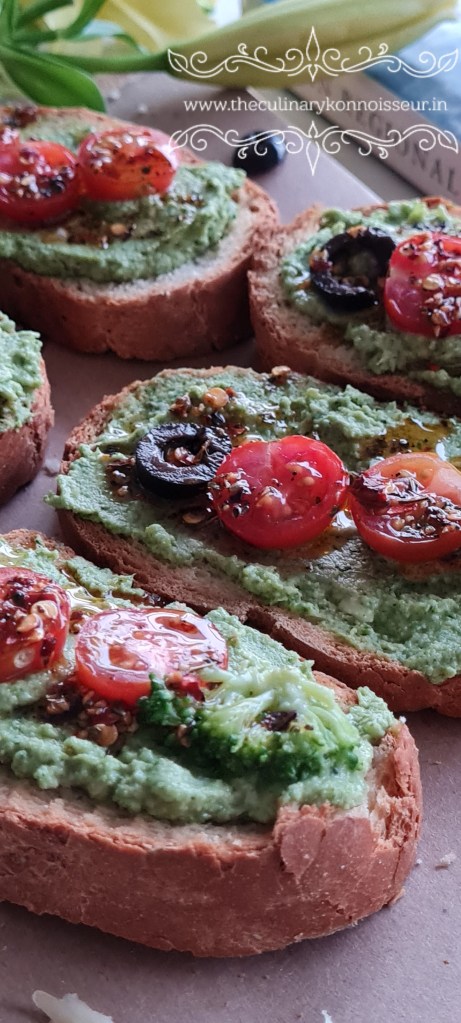 - To assemble, spread a thick layer of broccoli pesto on to each slice of crostini and then top with sliced cherry tomatoes and olives.