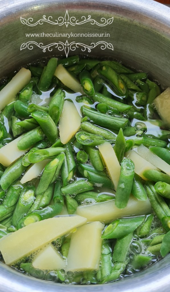 - Heat 2 cups water in a saucepan with ½ teaspoon salt. Parboil the potato juliennes & French beans for 3-4 minutes until still firm (not yet soft). Drain thoroughly.
