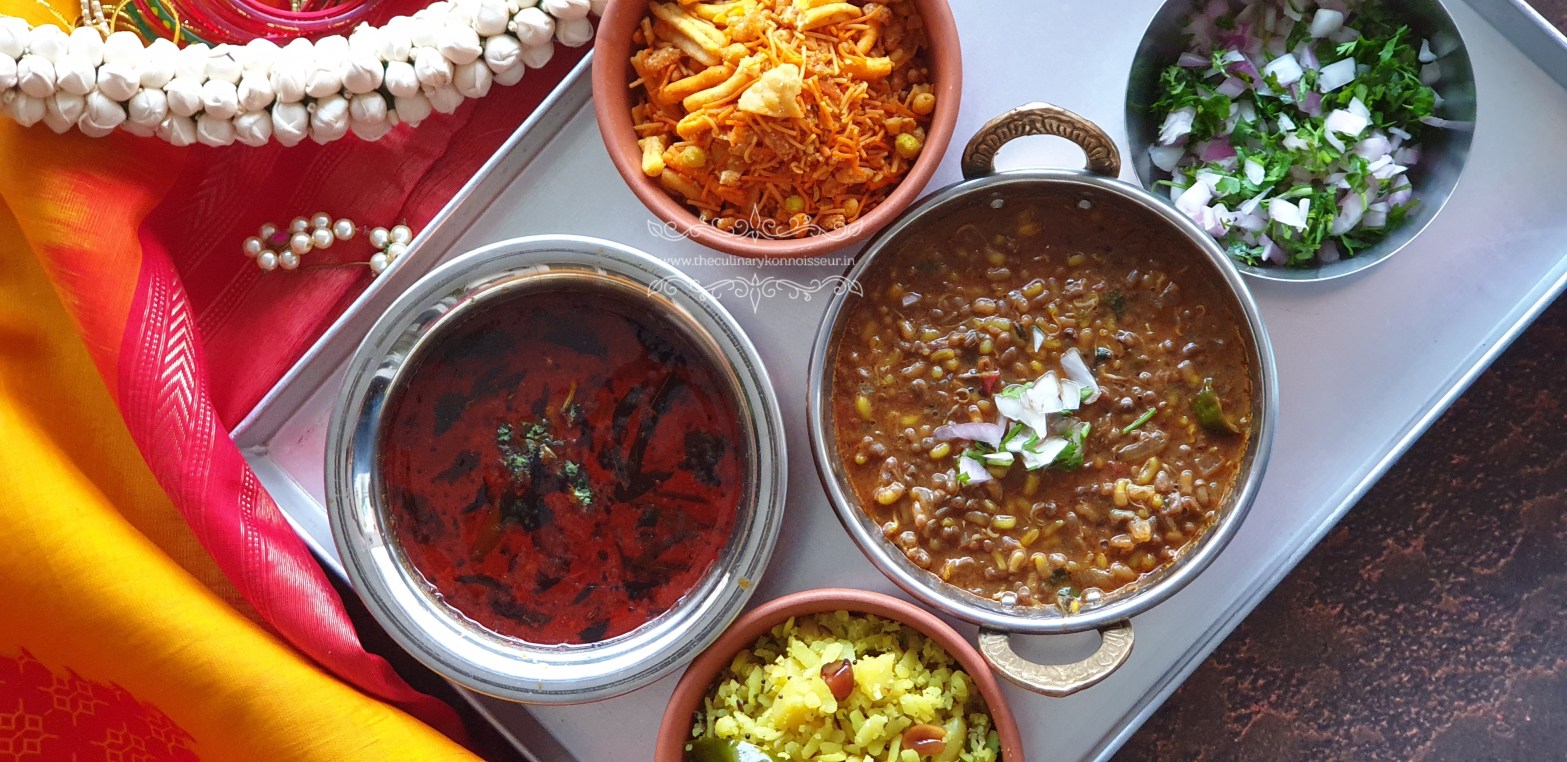 The base layer is simply an aromatic, piping hot, sprouted moth beans curry or matki usal cooked with a traditional spice mix and tamarind paste.