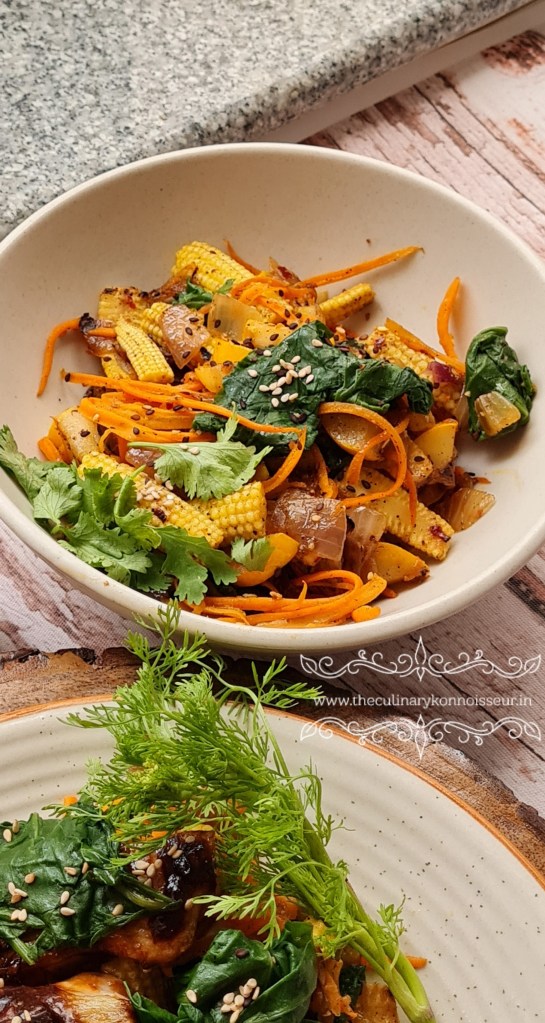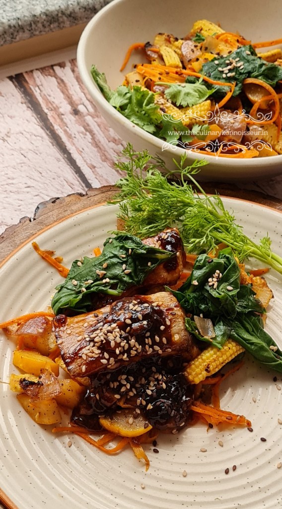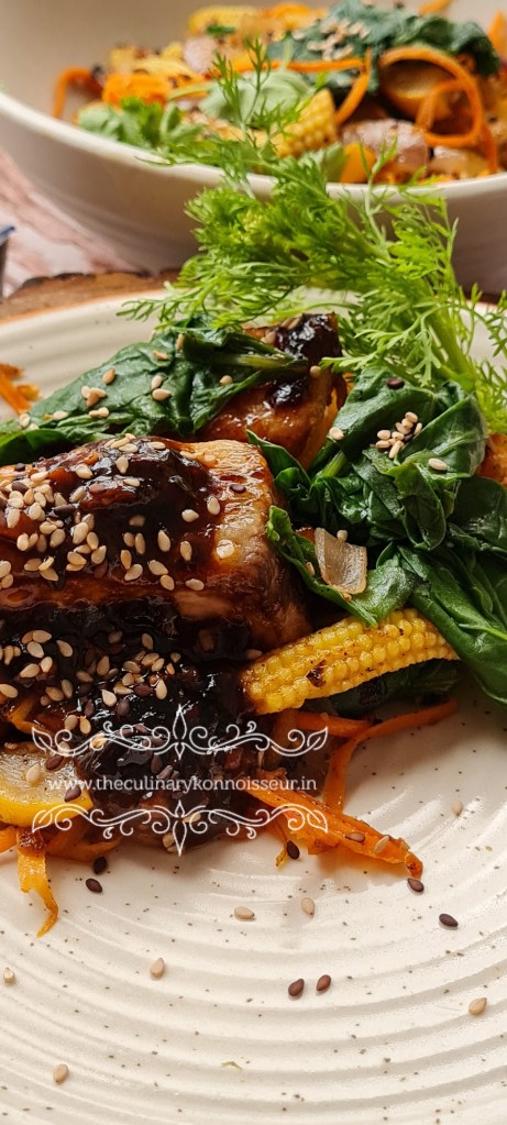 - Remove from the oven & transfer onto serving plates. Garnish with sesame seeds and serve with stir fried vegetables and noodles or rice.