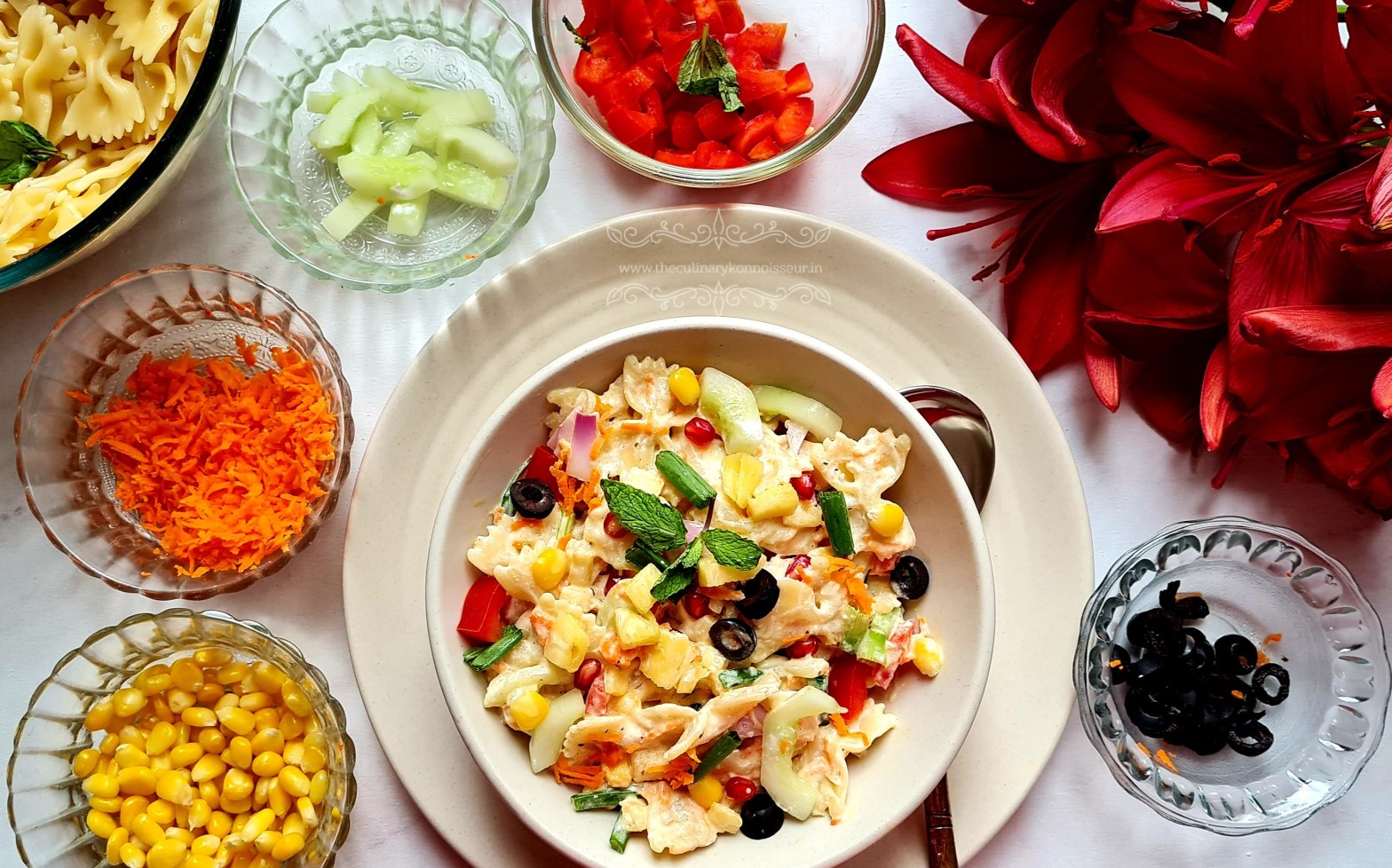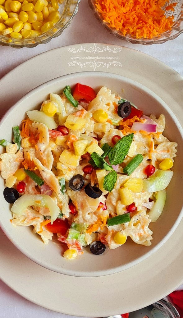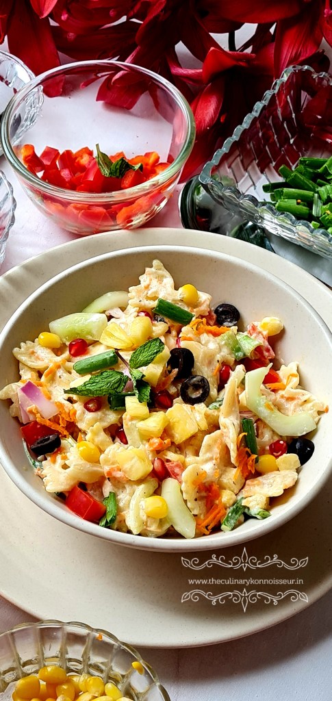 A light summery cold pasta salad full of refreshing flavours, textures, colour and crunch. Loaded with the goodness of fresh pineapple, onions, sweet corn, red peppers, avocados, jalapenos, pomegranate seeds & black olives. The addition of a protein element such as tofu, red kidney beans or boiled egg chunks for vegetarians or then cooked ham, tuna chunks or boiled / barbeque chicken for non-vegetarians makes this one a crowd pleaser!